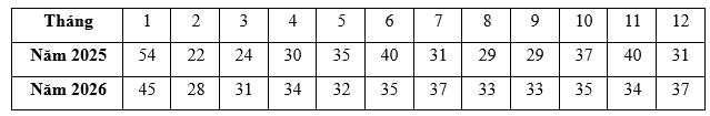 Câu 21 [1038160]: Một cửa hàng bán xe ô tô thay đổi chiến lược kinh doanh vào cuối năm 2025. Số xe của hàng bán được mỗi tháng trong năm 2025 và 2026 được ghi lại ở bảng sau: