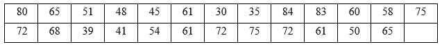 Sắp xếp lại mẫu số liệu theo thứ tự không giảm: 30; 35; 39; 41; 45; 48; 50; 51; 54; 58; 60; 61; 61; 61; 65; 65; 68; 72; 72; 72; 75; 75; 80; 83; 87.