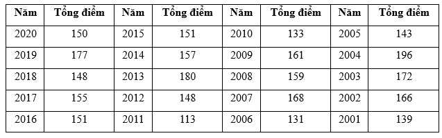 Câu 16 [1038155]: Tổng số điểm mà các thành viên đội tuyển Olympic Toán quốc tế (IMO) của Việt Nam đặt được trong 20 kì thi được cho ở bảng sau:
