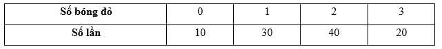 Câu 19 [1038158]: An lấy ra ngẫu nhiên 3 quả bóng từ một hộp có chứa nhiều bóng xanh và bóng đỏ. An đếm xem có bao nhiêu bóng đỏ trong 3 bóng lấy ra rồi trả bóng lại hộp. An lặp lại phép thử trên 100 lần và ghi lại kết quả ở bảng sau: