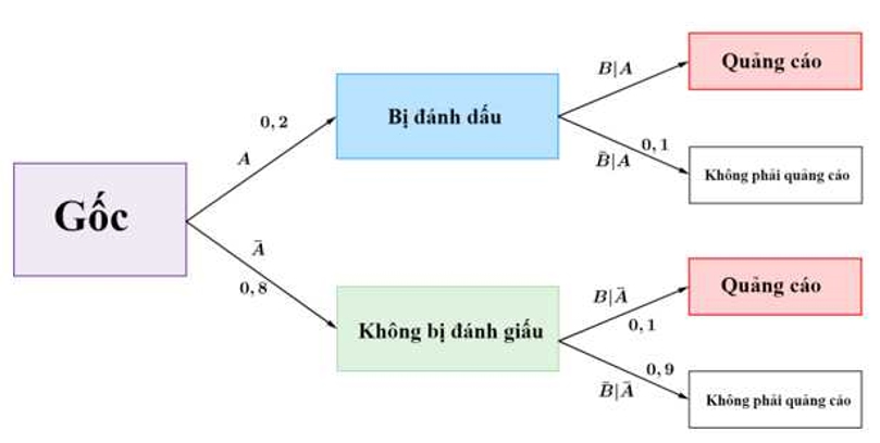 Câu 2 [1038603]: Một phần mềm nhận dạng tin nhắn quảng cáo trên điện thoại bằng cách dựa theo từ khóa để đánh đấu một số tin nhắn được gửi đến. Qua một thời gian dài sử dụng, người ta thấy rằng trong số tất cả các tin nhắn gửi đến, có 20% số tin nhắn bị đánh dấu. Trong số các tin nhắn bị đánh dấu, có 10% số tin nhắn không phải là quảng cáo. Trong số các tin nhắn không bị đánh dấu, có 10% số tin nhắn là quảng cáo. Chọn ngẫu nhiên một tin nhắn được gửi đến điện thoại.