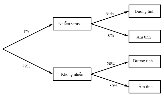 Một xét nghiệm Covid - 19 cho kết quả dương tính với 90% các trường hợp thực sự nhiễm virus và cho kết quả âm tính với 80% các trường hợp thực sự không nhiễm virus. Biết rằng tỉ lệ người nhiễm Covid - 19 trong một cộng đồng nào đó là 1%.