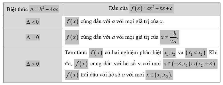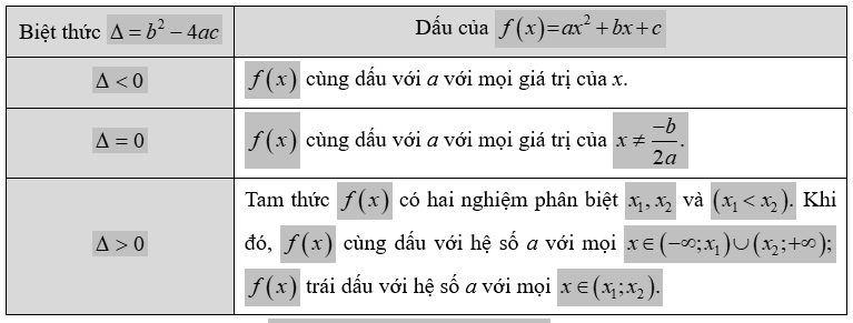 Dấu của tam thức bậc hai được thể hiện trong bảng sau: