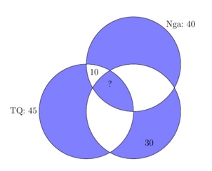 Trong một hội nghị có 100 đại biểu tham dự. Mỗi đại biểu có thể sử dụng ít nhất một trong ba thứ tiếng: Nga, Trung Quốc và Anh. Biết rằng có 30 đại biểu chỉ nói được tiếng Anh, 40 đại biểu nói được tiếng Nga, 45 đại biểu nói được tiếng Trung Quốc và 10 đại biểu chỉ nói được hai thứ tiếng Nga và Trung Quốc. Có [[20845447]] đại biểu nói được tiếng Trung Quốc nhưng không nói được tiếng Nga. Có [[20845448]] đại biểu nói được cả ba thứ tiếng.