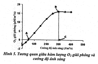 Đồ thị hình 5 thể hiện mối tương quan giữa hàm lượng O2 giải phóng và cường độ ánh sáng. Dựa vào đồ thị, hãy cho biết: