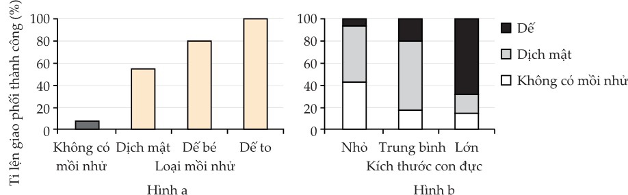 Tỉ lệ giao phối thành công cao (khoảng 55-100%) khi sử dụng mồi nhử (dịch mật hoặc con mồi). Ttỉ lệ giao phối thành công thấp (chỉ khoảng 5%) khi không sử dụng mồi nhử. Đáp án: A