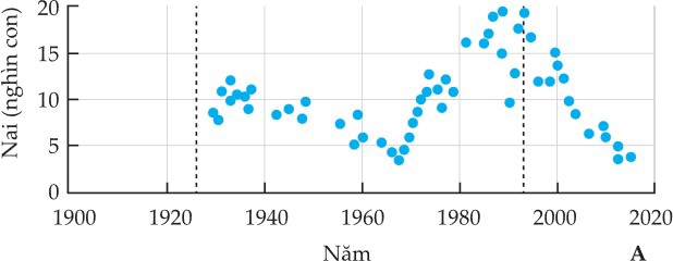 Sau khi du nhập sói xám, do điều kiện thuận lợi từ môi trường (con mồi dồi dào) \rightarrow Quần thể sói tăng nhanh làm giảm mạnh số lượng nai sừng tấm.