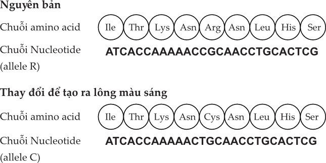 Biểu đồ dưới đây cho thấy một phần chuỗi amino acid của MC1R, một phần chuỗi nucleotide trong gene MC1R và cách nó có thể thay đổi để tạo ra lông màu sáng.