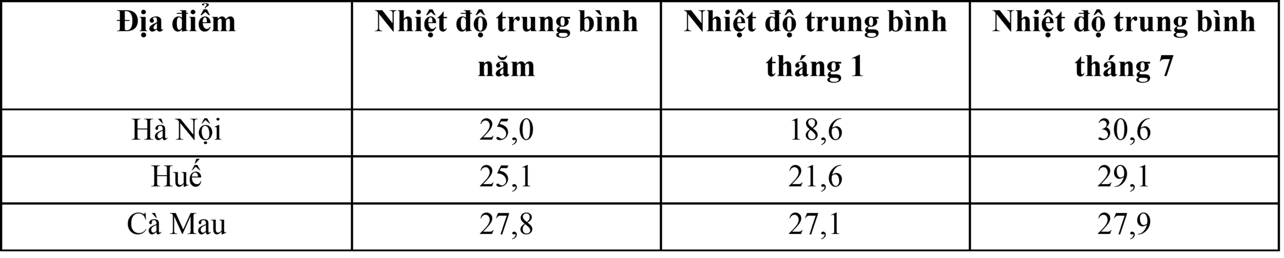 Nhiệt độ trung bình năm, nhiệt độ trung bình tháng 1 và tháng 7 tại một số địa điểm