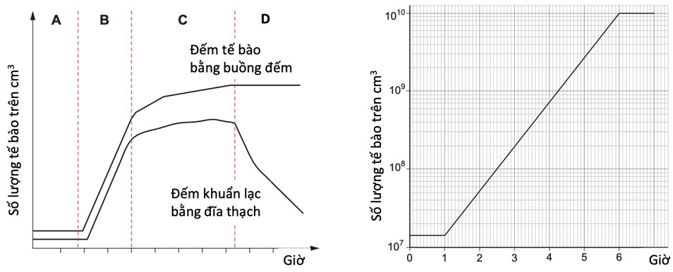 Một bình môi trường vô trùng được cấy một số lượng nhỏ tế bào vi khuẩn. Số lượng vi khuẩn trên mỗi cm3 môi trường nuôi cấy được theo dõi định kỳ bằng cách sử dụng phương pháp đếm khuẩn lạc trên đĩa thạch và đếm vi khuẩn bằng buồng đếm tế bào. Kết quả được vẽ như trong đồ thị bên dưới.