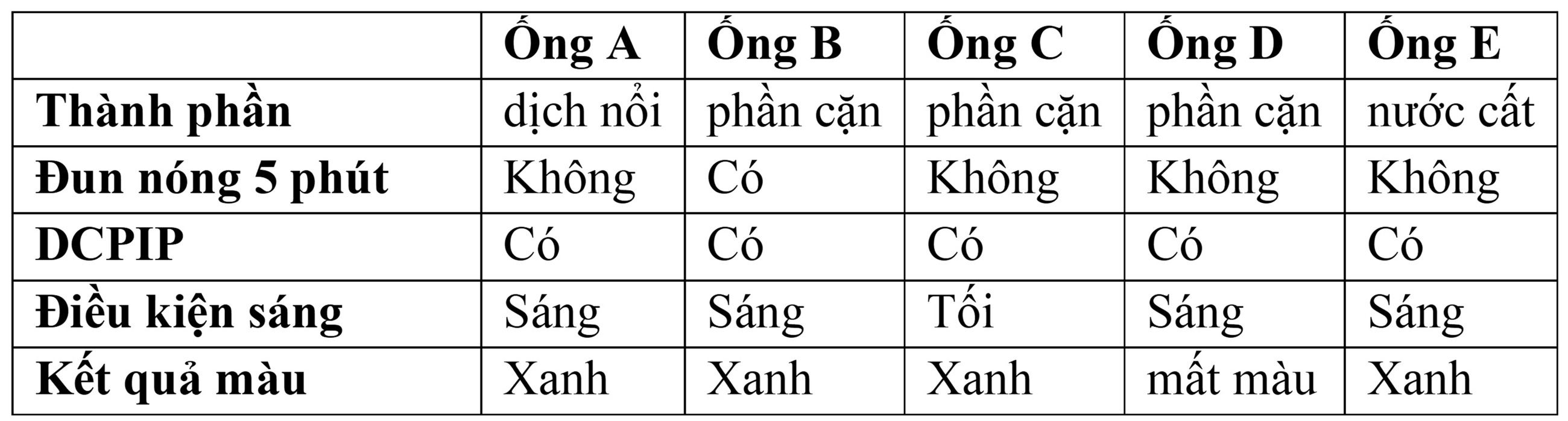 - Kiểm tra phản ứng đối với DCPIP trong các điều kiện khác nhau. Kết quả thí nghiệm được trình bày trong bảng bên dưới.