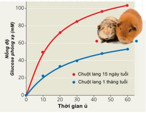 Trong chuyển hóa năng lượng, glucose là nguồn nguyên liệu quan trọng nhất trong tất cả các sinh vật để tạo ra năng lượng trong quá trình hô hấp tế bào. Ở tế bào động vật, glucose được vận chuyển vào máu bằng cơ chế vận chuyển thụ động nhờ một loại protein vận chuyển và được dự trữ dưới dạng glycogen trong gan. Các nhà khoa học đã tiến hành thí nghiệm để kiểm tra sự hấp thụ glucose vào máu phụ thuộc vào độ tuổi. Đối tượng thí nghiệm là tế bào hồng cầu của chuột lang 15 ngày tuổi và chuột lang 1 tháng tuổi. Người ta ủ tế bào hồng cầu của chuột lang trong dung dịch glucose phóng xạ ở độ pH 7,4 và 25oC. Cứ sau 10 hoặc 15 phút, họ lại lấy mẫu tế bào ra và đo nồng độ glucose phóng xạ bên trong tế bào đó. Kết quả thí nghiệm được biểu diễn trên sơ đồ dưới đây: