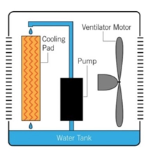 Khi quạt hoạt động, nước trong bình chứa sẽ được bơm lên tấm làm mát (cooling pad). Không khí nóng từ môi trường bên ngoài đi qua tấm làm mát này, nhiệt của không khí sẽ bị hấp thụ bởi quá trình bay hơi của nước. Kết quả là, luồng không khí thoát ra từ quạt sẽ mát mẻ và dễ chịu hơn.
