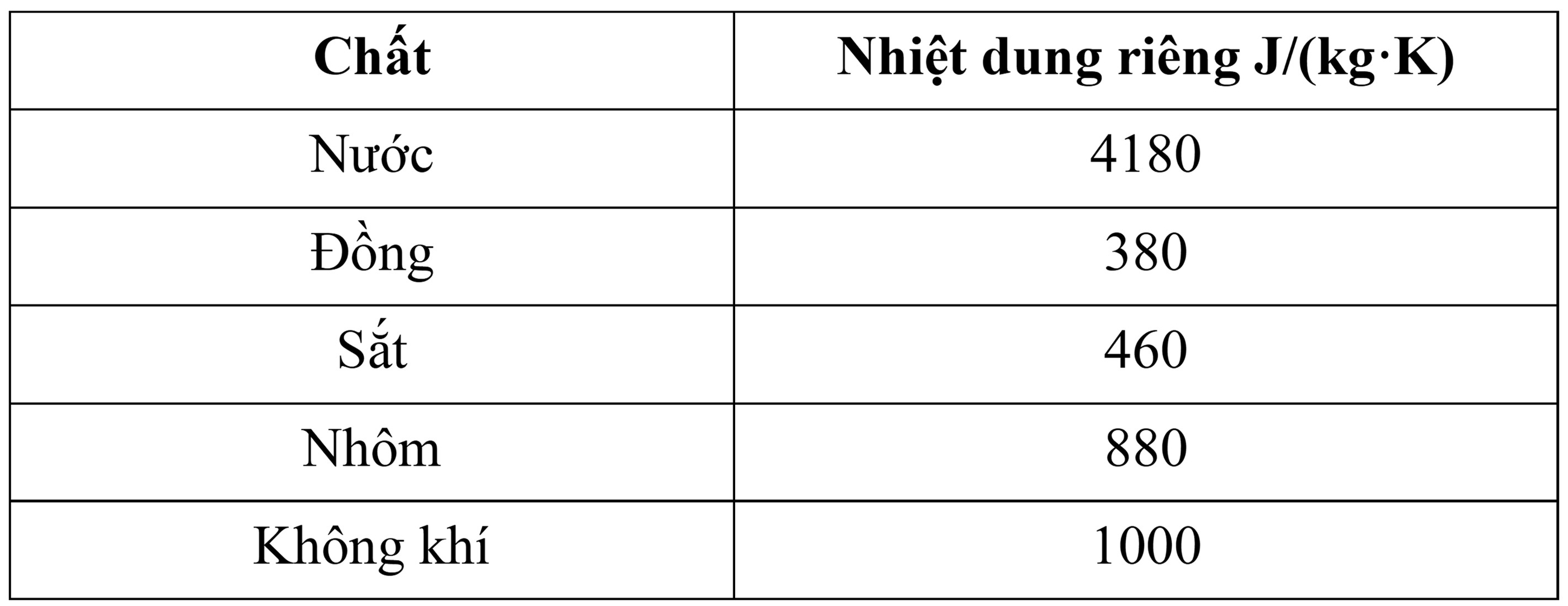 Bảng dưới đây là bảng nhiệt dung riêng của một số chất: