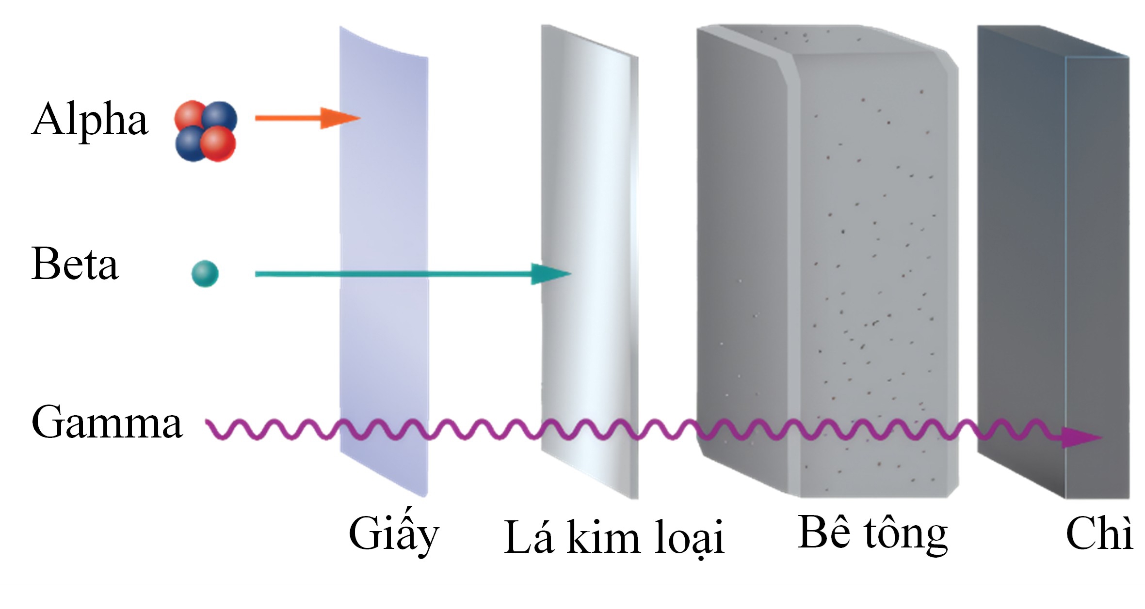 Hình vẽ. Thí nghiệm tính đâm xuyên của các tia phóng xạ qua các vật liệu khác nhau.