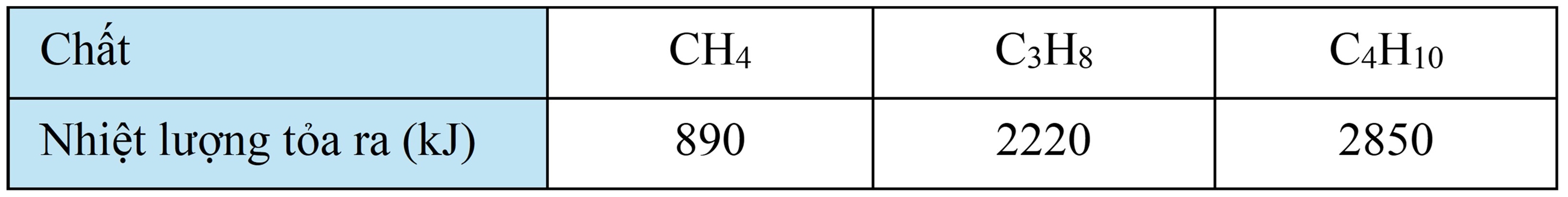 Câu 3 [1073365]: Khí biogas (giả thiết chỉ chứa CH4) và khí gas (chứa 40% C3H8 và 60% C4H10 về thể tích) được dùng phổ biến làm nhiên liệu và đun nấu. Nhiệt lượng tỏa ra khi đốt cháy hoàn toàn 1 mol các chất như bảng sau: