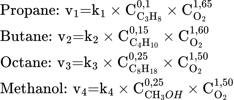 Biểu thức tốc độ phản ứng ứng với các nhiên liệu là: