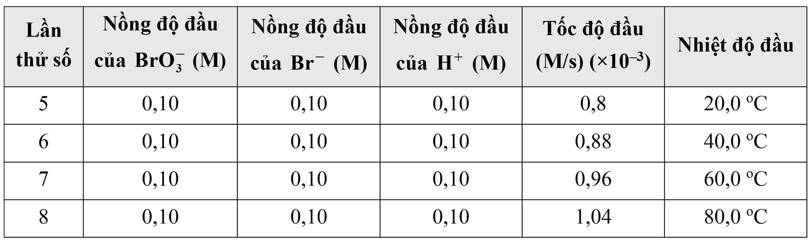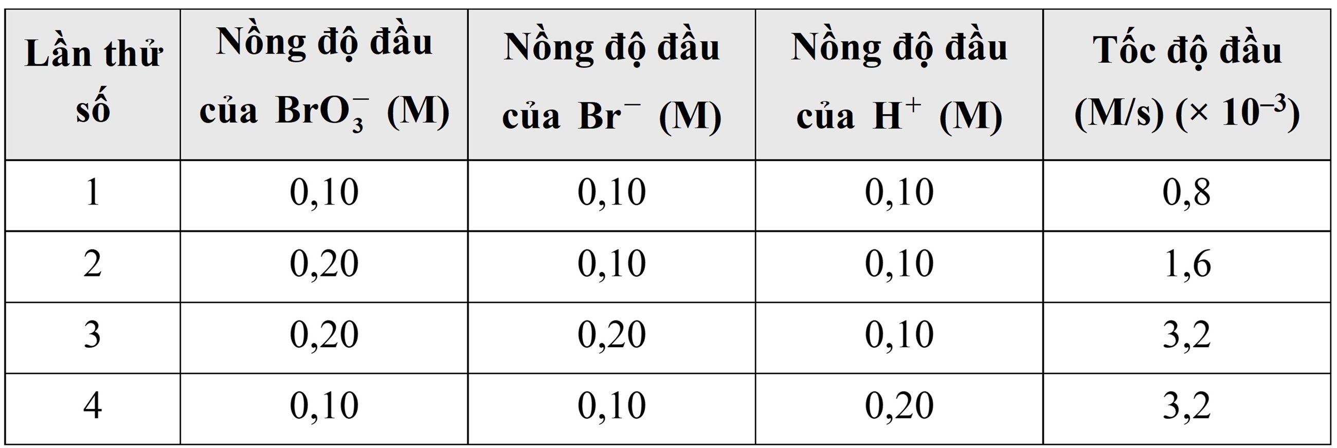 Lần thử số 1: Nồng độ của BrO3–, Br– và H+ lần lượt là 0,1 M; 0,1 M và 0,1 M. Tốc độ đầu là 0,8.10-3 (M/s)
