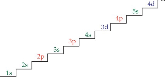 Nguyên tử hydrogen là một nguyên tử đặc biệt đơn giản vì nó chỉ chứa duy nhất một electron. Electron này có thể tồn tại trên phân lớp 1s (trạng thái cơ bản) hoặc nó có thể nhảy lên các phân lớp có mức năng lượng cao hơn (trạng thái kích thích). Tuy nhiên với các nguyên tử có nhiều electron hơn, chúng ta cần biết các electron này được phân bố như thế nào trong các phân lớp (cấu hình electron ở trạng thái cơ bản).Các electron trong một nguyên tử sẽ được sắp xếp theo một trật tự xác định, nó sẽ được điền lần lượt vào các phân lớp có mức năng lượng từ thấp đến cao như sau: