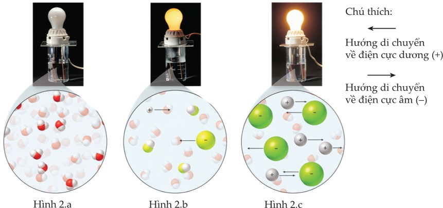 Mức độ sáng của bóng đèn phụ thuộc vào số lượng ion trong dung dịch. Trong hình 2.b, dung dịch chứa chất điện li yếu nên số lượng các ion tương đối nhỏ, bóng đèn chỉ sáng yếu. Dung dịch trong hình 2.c chứa chất điện ly mạnh, tạo ra một lượng ion tương đối lớn nên bóng đèn sáng mạnh.