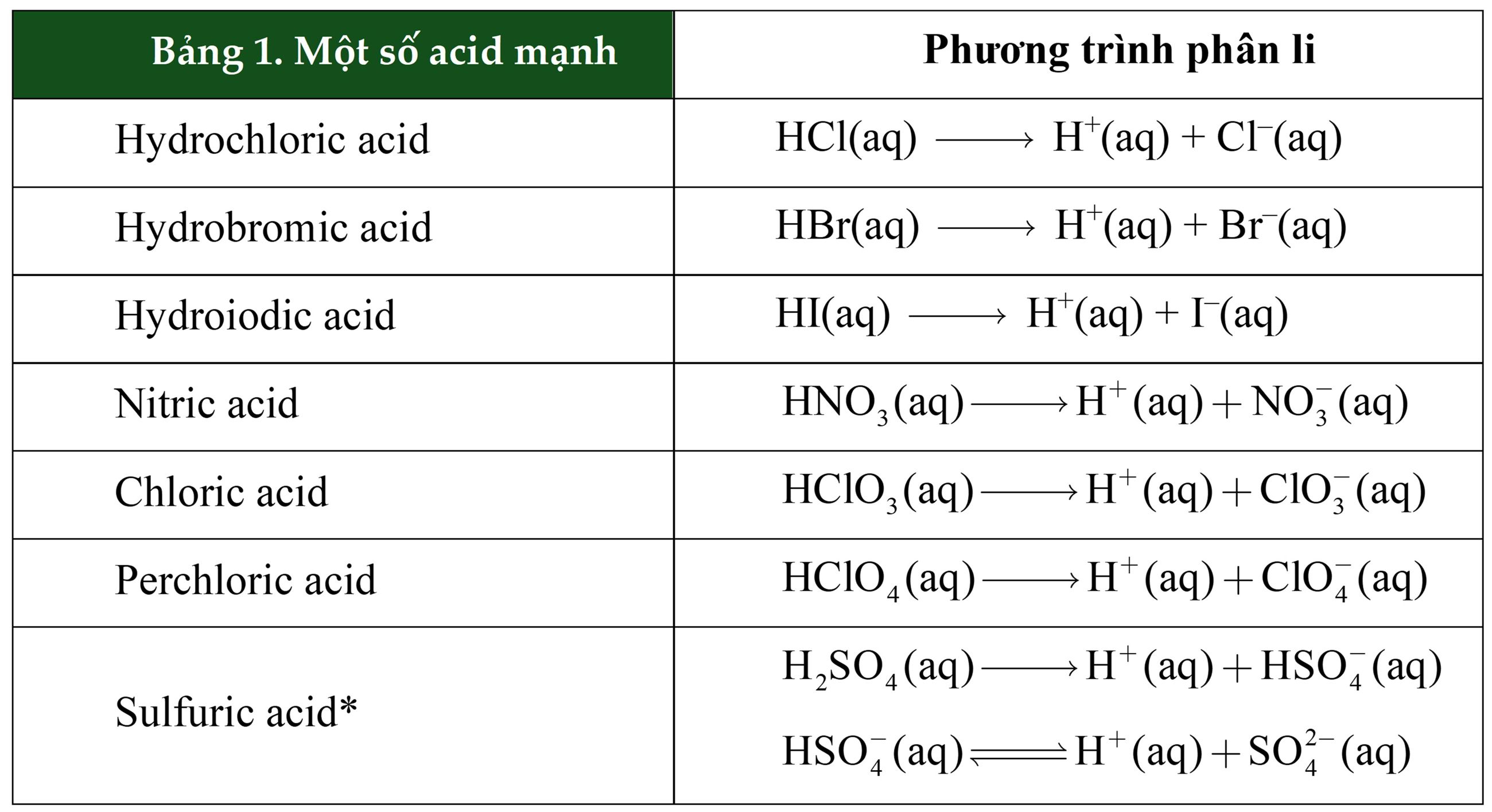 Danh sách bảy acid mạnh được liệt kê trong Bảng 1. Một acid mạnh khi bị phân li hoàn toàn sẽ tạo thành dung dịch chứa ion hydrogen và các anion tương ứng: