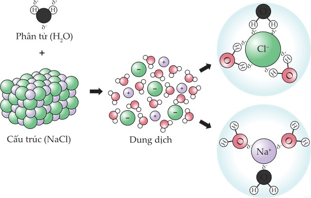 Trong phân tử H2O, nguyên tử H mang một phần điện tích dương có thể tương tác với các anion, nguyên tử O mang một phần điện tích âm sẽ tương tác với các cation. Vì thế phân tử H2O có thể bao quanh cả cation và anion. Từ đó làm hạn chế, cản trở việc cation Na+ và anion Cl– hút nhau để kết hợp ngược trở lại thành phân tử NaCl ban đầu.