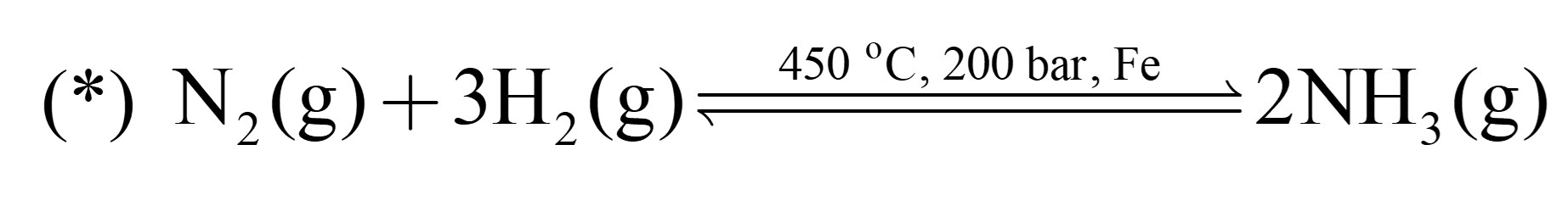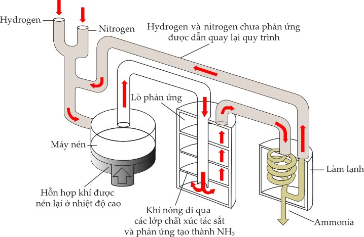 Quy trình Haber được sử dụng trong công nghiệp để sản xuất ra ammonia, phần lớn dùng để sản xuất phân bón, phương trình được biểu diễn như sau: