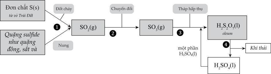 Câu 2 [703986]: Một trong những hóa chất quan trọng nhất được sản xuất và sử dụng trên toàn thế giới là sulfuric acid. Sulfuric acid được sử dụng trong sản xuất kim loại, sản xuất sơn, phân bón, ắc quy ô tô, chất tẩy rửa, thuốc nhuộm và sợi và trong nông nghiệp. Quá trình dưới đây cho phép sản xuất sulfuric acid nồng độ cao với số lượng lớn.