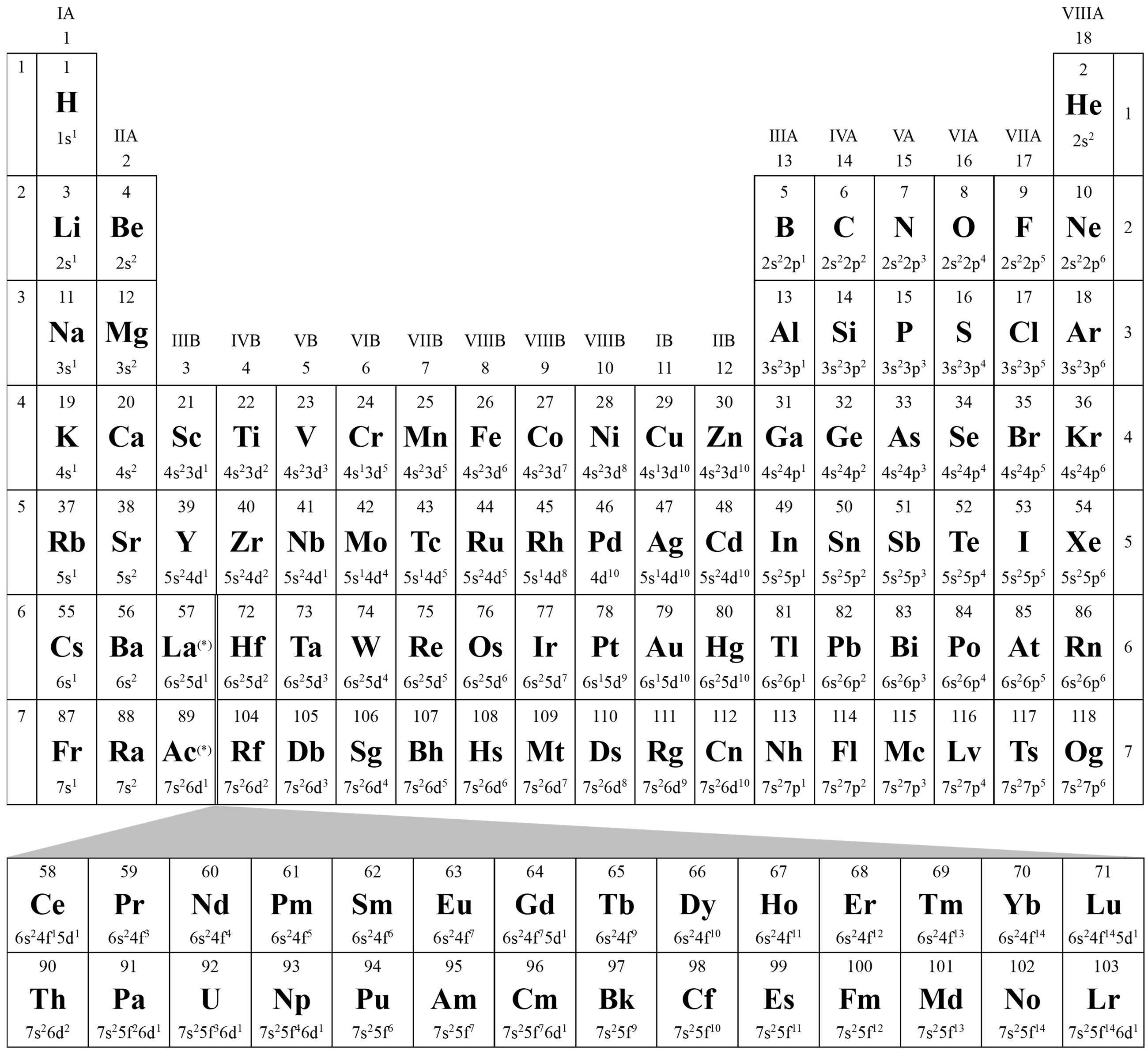 Hình ảnh dưới đây cho thấy bảng tuần hoàn hiện đại cùng với cấu hình electron ở trạng thái cơ bản trên lớp ngoài cùng của các nguyên tố.