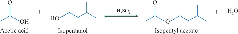 Acetic acid và isopentanol đã được đun nóng với sự có mặt chất xúc tác acid trong một giờ để tạo ra isopentyl acetate, một ester có mùi chuối. Sau phản ứng, bình cũng sẽ chứa sản phẩm, các chất tham gia ban đầu: