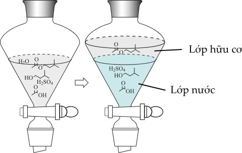 - Sau khi phản ứng tạo isopentyl acetate (isoamyl acetate) — một ester có tính kị nước (không tan trong nước) — người ta rót hỗn hợp vào phễu chiết, cho thêm nước và dung môi hữu cơ (thường là ether, chloroform hoặc hexane).