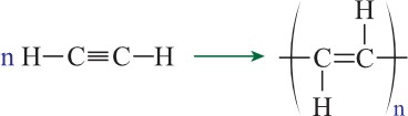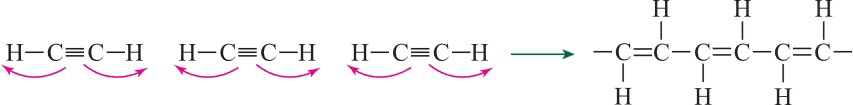 Cho đến nay bạn đã thấy rằng có thể polymer hóa các hợp chất hữu cơ bằng liên kết đôi C=C trong các hợp chất alkene. Các polymer thu được (ví dụ, polyethylene) có liên kết đơn C–C. Tuy nhiên, cũng có thể trùng hợp các hợp chất hữu cơ bằng liên kết ba C≡C. Hợp chất đơn giản nhất (thuộc alkyne) là acetylene (C2H2), thường được sử dụng trong kĩ thuật hàn. Phản ứng trùng hợp acetylene rất giống với phản ứng trùng hợp ethylene. Nghĩa là, một phân tử ban đầu gắn vào một trong các nguyên tử carbon của phân tử tiếp theo và phá vỡ một liên kết π giữa hai nguyên tử carbon trong acetylene. Do đó, polymer thu được, polyacetylene, vẫn giữ được liên kết đôi C=C:
