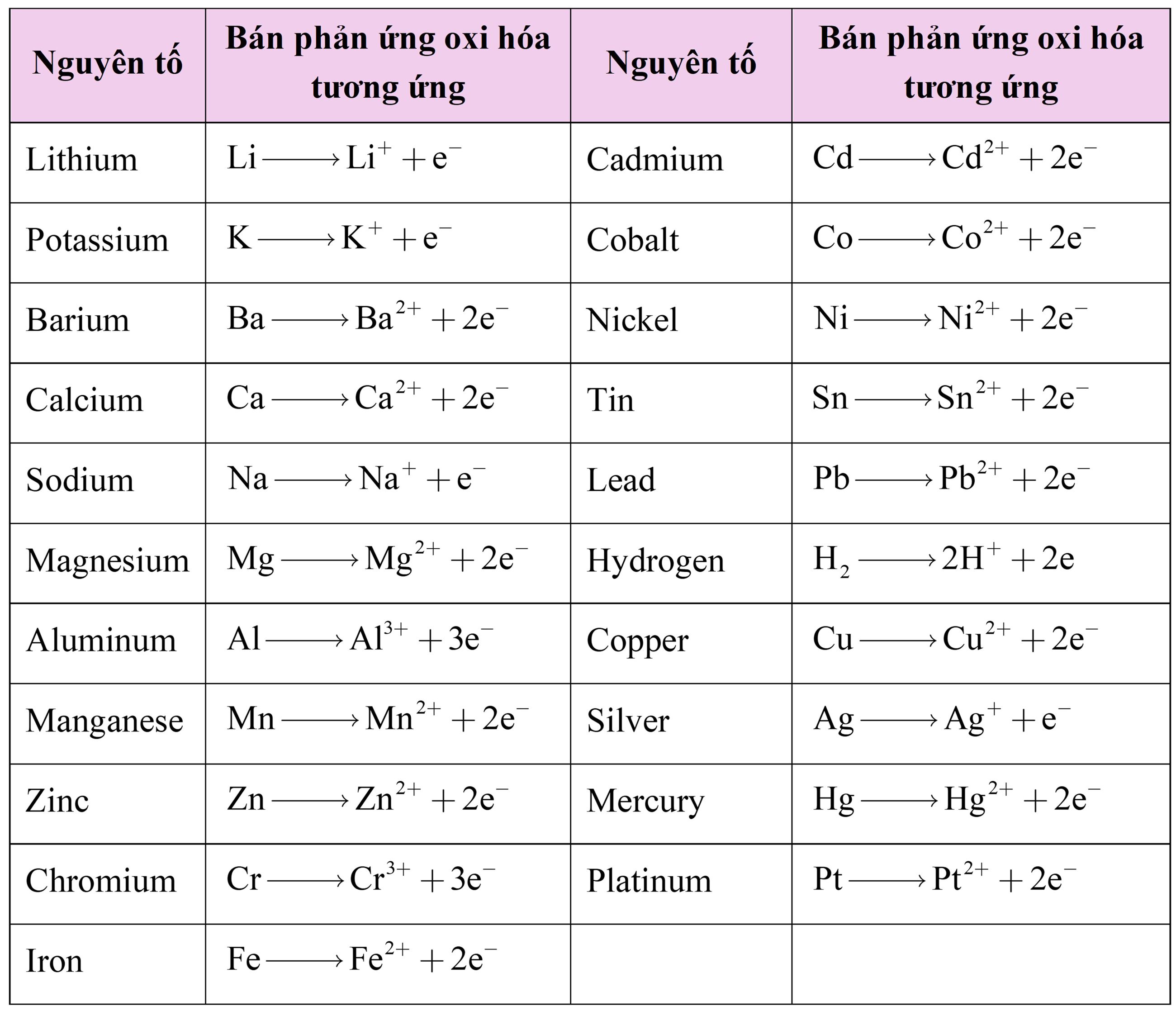 Dãy hoạt động hóa học của kim loại (Bảng 2) là danh sách các kim loại (và hydrogen) được sắp xếp từ trên xuống dưới theo chiều dễ bị oxy hóa giảm dần. Cột thứ hai hiển thị bán phản ứng oxy hóa tương ứng với từng nguyên tố trong cột đầu tiên. Lưu ý vị trí của sắt và đồng trong bảng. Sắt xuất hiện ở vị trí cao hơn trong bảng và do đó dễ bị oxy hóa hơn. Trên thực tế, một nguyên tố trong dãy sẽ bị oxy hóa bởi các ion của bất kỳ nguyên tố nào xuất hiện bên dưới nó. Do đó, theo bảng 2, kim loại sắt sẽ bị oxy hóa bởi dung dịch chứa bất kỳ ion nào sau đây: Cr3+, Fe2+, Cd2+, Co2+, Ni2+, Sn2+, H+, Cu2+, Ag+, Hg2+, Pt2+, hoặc Au3+. Mặt khác, sắt sẽ không bị oxy hóa bởi dung dịch chứa các ion Mn2+, Al3+, Mg2+, Na+, Ca2+, Ba2+, K+, Li+.