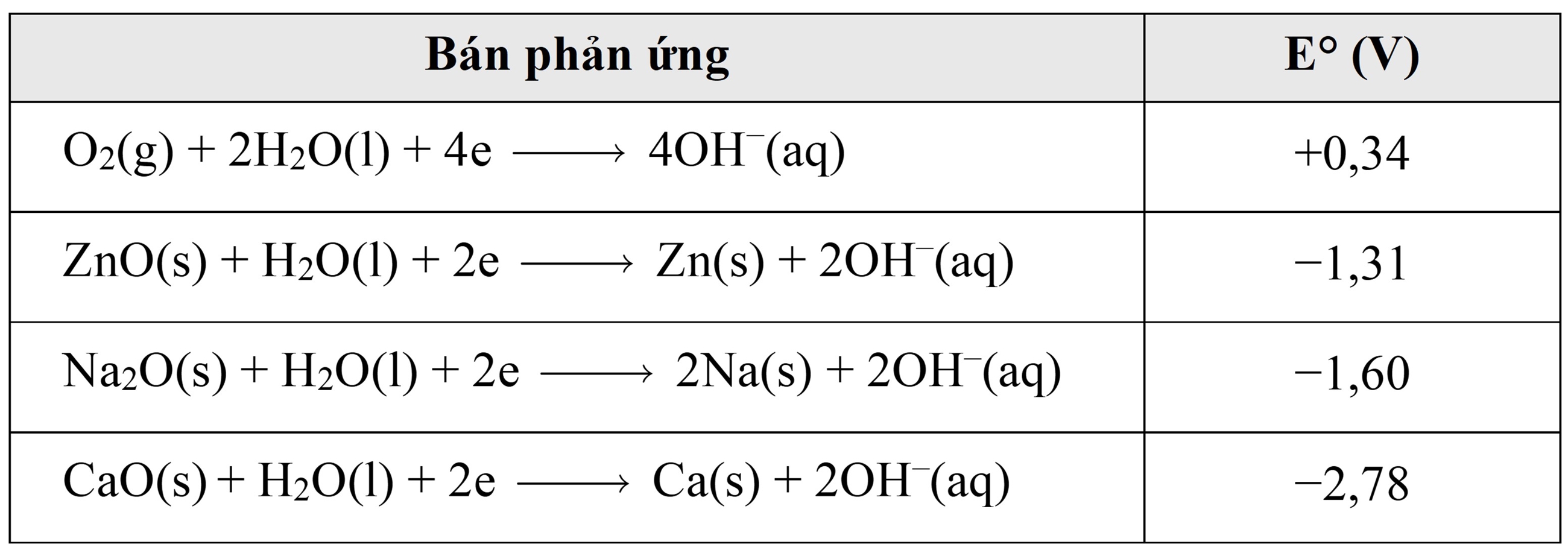 2ZnO(s).Sử dụng dữ liệu trong bảng trên, sức điện động chuẩn của pin đo được là bao nhiêu?