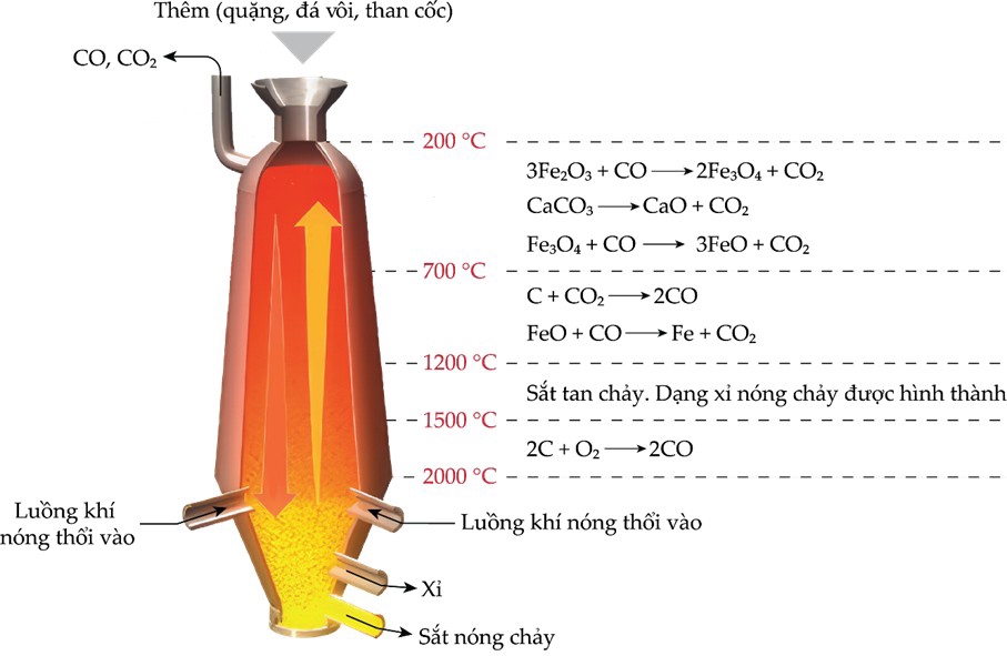 Quặng sắt đậm đặc, đá vôi (CaCO3), than cốc được đưa vào lò từ trên xuống. Một luồng không khí nóng được đẩy vào trong lò từ phía dưới nên còn có tên gọi là lò cao. Khí oxygen phản ứng với carbon trong than cốc để tạo thành chủ yếu là carbon monoxide (CO) và một ít carbon dioxide (CO2). Những phản ứng này tỏa nhiệt cao và khi khí CO và CO2 nóng lên, chúng phản ứng với các hợp chất sắt oxide ở các vùng nhiệt độ khác nhau như trong hình vẽ trên. Các bước chính trong việc khai thác sắt là: