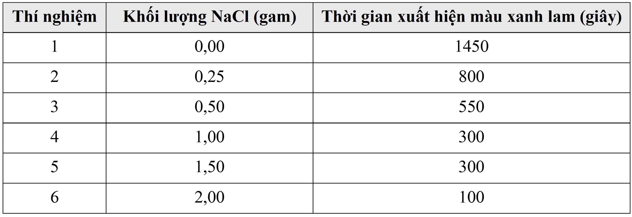 Nhận định A – Đúng. Khối lượng NaCl thêm vào càng nhiều thì thời gian để dung dịch xuất hiện màu xanh lam càng sớm.