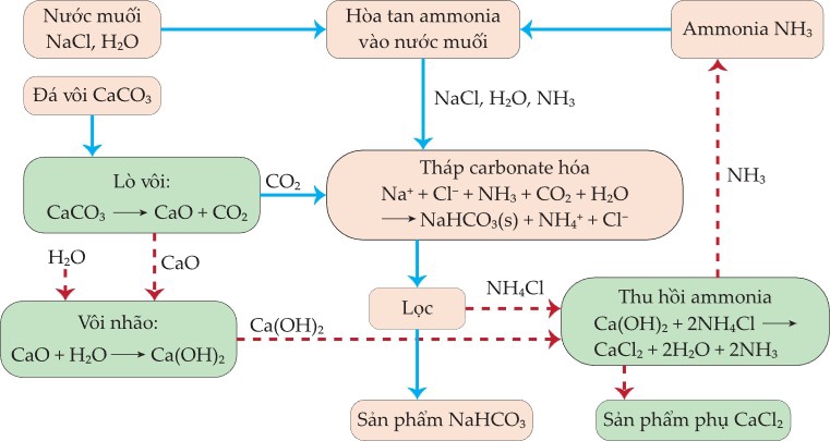- Ammonia (NH3): Tham gia vào phản ứng với nước muối để tạo ra ammonia và ammonium bicarbonate, một bước quan trọng trong quá trình Solvay.
