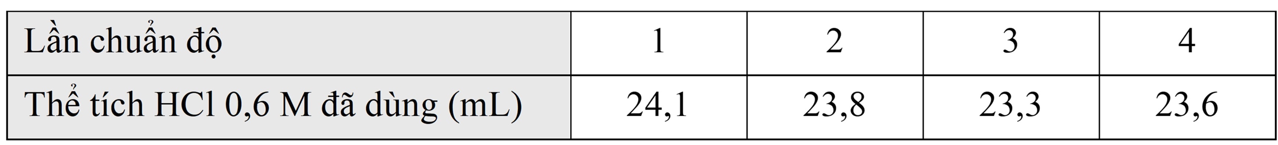 Kết quả thí nghiệm chuẩn độ được cho dưới bảng sau: