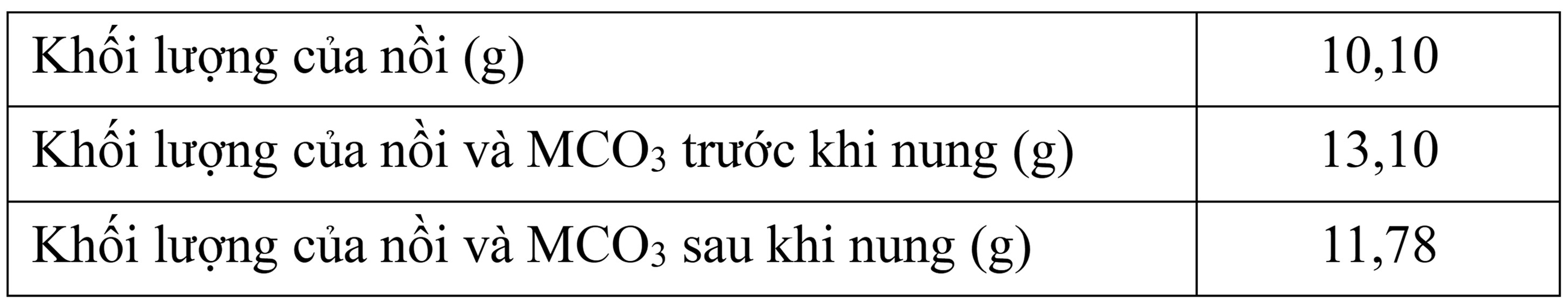 Một nhà khoa học cần xác định kim loại trong một loại muối carbonate MCO3. Tiến hành thí nghiệm: Muối MCO3 được nung trong nồi ba phút. Khi đó muối MCO3 bị phân hủy tạo thành oxide kim loại rắn MO và khí carbon dioxide.MCO3 → MO + CO2