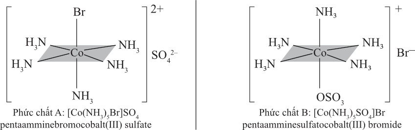 ▪ Phức chất A: [Co(NH3)5Br]SO4 màu đỏ tím với phối tử Br– ở cầu nội và SO42– ở cầu ngoại.