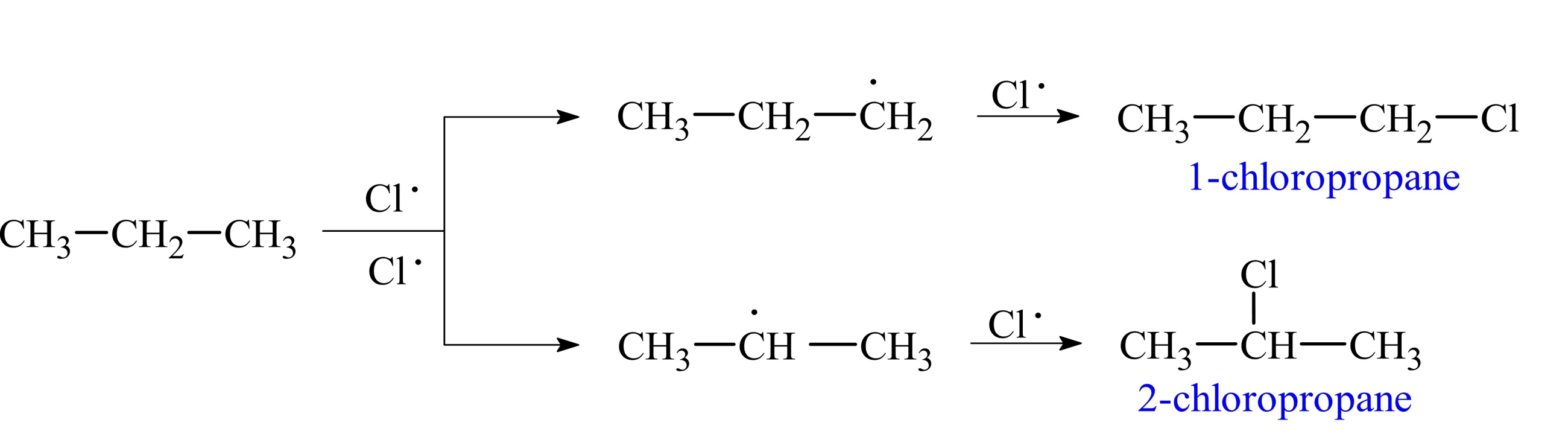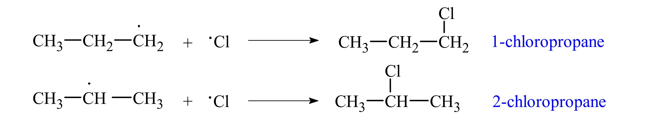 Có một điều đặc biệt là tỉ lệ sản phẩm 1-chloropropane và 2-chloropropane không giống nhau (không phải là 50 : 50) mà có sự chênh lệch. Thông quan các nghiên cứu, các nhà khoa học nhận thấy rằng xu hướng tạo thành sản phẩm có liên quan đến bậc của các gốc tự do: “Bậc của gốc tự do càng lớn thì càng bền và càng dễ tạo thành sản phẩm”.
