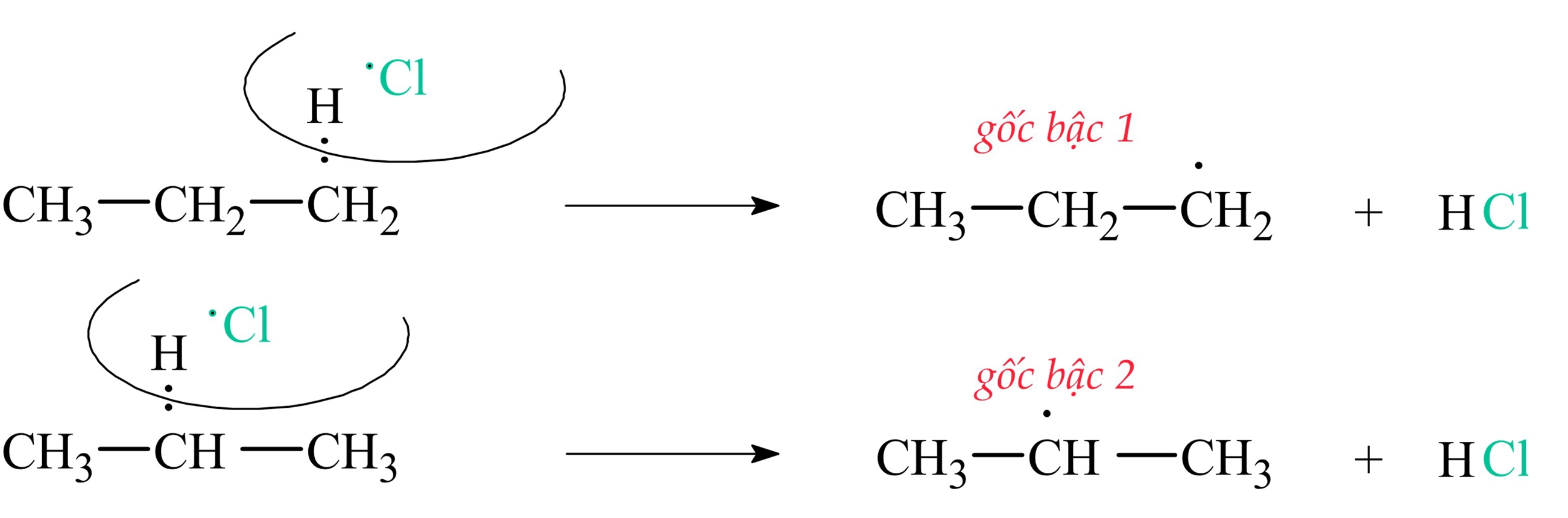 Gốc tự do Cl• được sinh ra sẽ lấy đi 1 H• của phân tử propane. Và vì có hai loại nguyên tử H nên sẽ hình thành hai gốc tự do khác nhau.