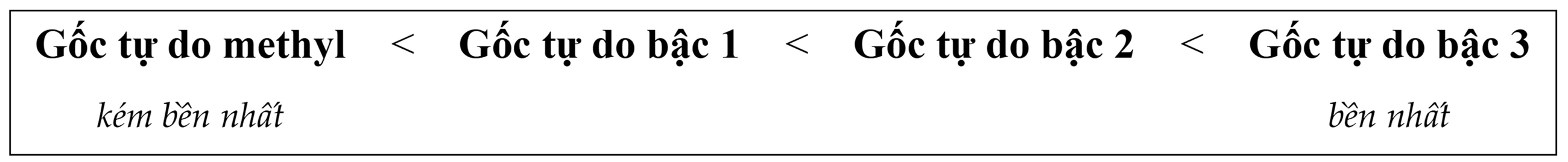 Gốc tự do methyl < gốc tự do bậc 1 < gốc tự do bậc 2 < gốc tự do bậc 3