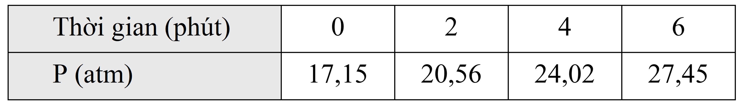 Phosphorus pentachloride (PCl5; M = 208,5 g/mol) là chất khí được sử dụng làm chất clo hóa và chất xúc tác trong sản xuất hóa chất hữu cơ, chất trung gian, thuốc nhuộm. Ở nhiệt độ 250 °C, PCl5 bị phân huỷ theo phương trình: PCl5(g) ⇌ PCl3(g) + Cl2(g).Một học sinh nghiên cứu sự phân huỷ của phosphorus pentachloride ở 250°C bằng cách cho phosphorus pentachloride vào bình có dung tích không đổi (1 lít) và ghi lại sự thay đổi áp suất của hỗn hợp phản ứng theo thời gian trong bảng kết quả dưới đây: