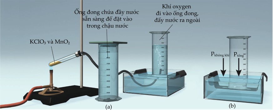2KCl(s) + 3O2(g).Thể tích nước bị khí chiếm chỗ bằng thể tích khí tạo ra. Chú ý trước khi đọc thể tích khí, phải điều chỉnh mức của bình chia độ sao cho mực nước bên trong và bên ngoài bình bằng nhau. Điều này đảm bảo áp suất bên trong bình chia độ bằng với áp suất khí quyển [Hình b]. Tuy nhiên, vì thể tích đo được chứa cả oxygen tạo ra bởi phản ứng và hơi nước nên áp suất tác dụng bên trong bình chia độ là tổng áp suất riêng phần của hai khí: