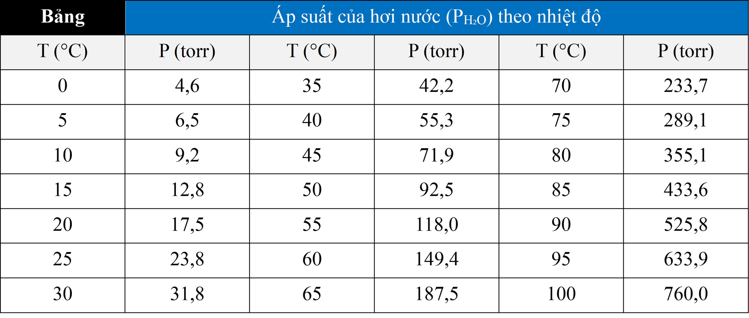 Bằng cách trừ áp suất riêng phần của nước khỏi áp suất tổng (bằng với áp suất khí quyển), chúng ta có thể xác định áp suất riêng phần của oxygen. Chúng ta có thể xác định áp suất riêng phần của nước, phụ thuộc vào nhiệt độ, từ bảng giá trị sau: