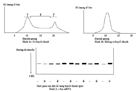 Khi các nguyên bào sợi của người bình thường được nuôi cấy trong môi trường chứa huyết thanh, chúng phân chia với thời gian trung bình khoảng 22h (M = 1 giờ, G1 = 10 giờ, S = 6 giờ, G2 = 5 giờ). Để xác định ảnh hưởng của sự thiếu hụt huyết thanh đối với chu kì tế bào, các tế bào được ủ 48 giờ trong môi trường có hoặc không có huyết thanh. Vào cuối quá trình này, tế bào thu và nhuộm bằng propidium iodide, chất này liên kết với DNA và phát huỳnh quang khi tiếp xúc với ánh sáng cực tím. Các tế bào nhuộm màu được phân tích hàm lượng DNA (huỳnh quang). Kết quả với huyết thanh được thể hiện trong hình 1a. Nếu thiếu huyết thanh, các tế bào ngừng tăng sinh và chuyển sang trạng thái tĩnh được thể hiện trong hình 1b.Trong thí nghiệm thứ hai, các tế bào bị thiếu huyết thanh trong 48 giờ và sau đó được điều trị bằng huyết thanh đơn thuần hoặc huyết thanh cộng với cyckoheximide (CHX), một chất ức chế tổng hợp protein. Tại các thời điểm khác nhau sau khi điều trị, RNA đã được phân lập từ các tế bào. Tổng hợp RNA tế bào bằng nhau từ mỗi mẫu được phân tích bằng điện di trên gel và phương pháp Northern blotting để phát hiện mức độ mRNA c-fos. Protein c-fos tham gia vào quá trình điều chỉnh sự tăng sinh của tế bào. Kết quả của thí nghiệm này được thể hiện trong hình 2.