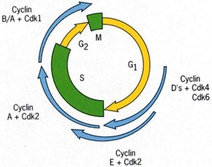 Nghiên cứu về sự điều hòa chu kỳ tế bào ở người cho thấy protein p16 (khối lượng phân tử 16kDa) có vai trò quan trọng trong quá trình chuyển tiếp từ pha G1 sang pha S, làm chậm sự tiến triển của chu kỳ tế bào. Bản chất của protein p16 là một chất ức chế enzyme kinase pha thuốc cyclin (Cdk). Khi không có p16, Cdk4 kết hợp với cyclin D và tạo thành phức hệ protein có hoạt tính, phức hệ này photphorin hóa một protein có tên là retinolastoma, làm giải phóng yếu tố phiên mã E2F1 (vốn bình thường ở trạng thái liên kết với retinolastoma).