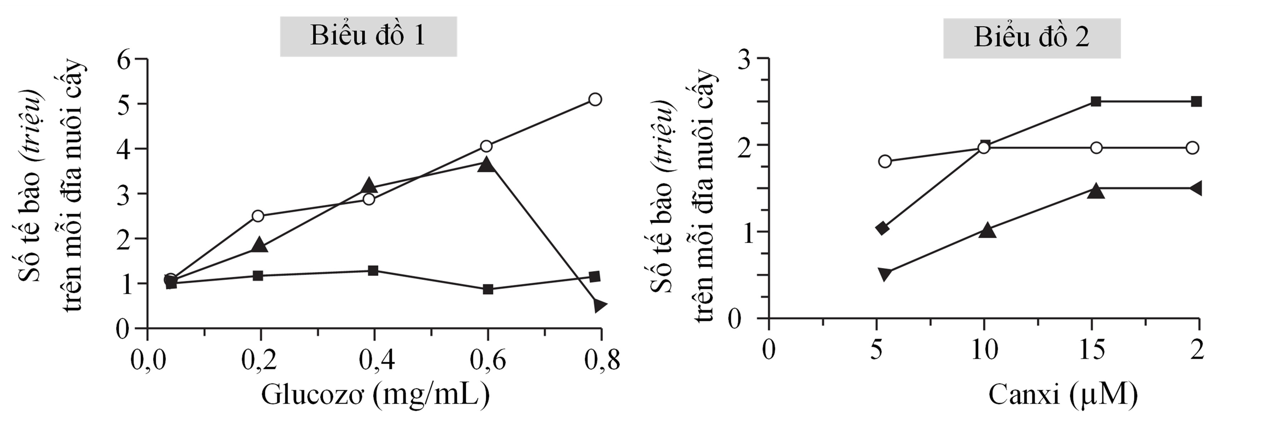 Câu 1 [381524]: Trên cơ sở thông tin trong biểu đồ 1 và 2, người ta có thể dự đoán rằng sự tăng trưởng của loại tế bào A sẽ lớn hơn so với loại tế bào C trong môi trường chứa