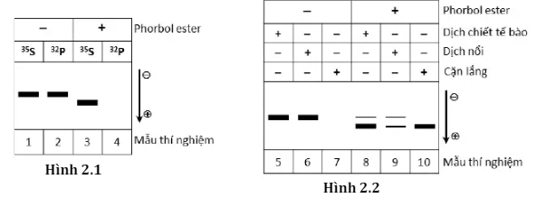 Hệ gene của virus HPV – 16 (human papilloma virus), một trong những loại virus gây ung thư cổ tử cung phổ biến ở người, chứa gene mã hoá 2 protein ung thư (E6 và E7) làm biến đổi tế bào biểu mô bình thường thành tế bào khối u. Người ta tiến hành các thí nghiệm để phân tích tác động của protein E7 đến các tế bào ở cấp độ phân tử, cụ thể là mối quan hệ của nó với protein retinoblastoma (Rb), một loại protein áp chế khối u liên kết với yếu tố phiên mã E2F điều hoà sự phiên mã của các gene mã hoá protein tham gia pha S của chu kì tế bào.Ở thí nghiệm thứ nhất (Hình 2.1), dòng tế bào ung thư bạch cầu (HL-60) được nuôi cấy trong điều kiện không có (-) hoặc có (+) xử lí với phorbol ester và được đánh dấu bằng 35S-methionine hoặc 32P – phosphate. Dịch chiết tế bào được dùng để điện di trên gel SDS-polyacrylamide và xử lí với kháng thể đặc hiệu của protein Rb. Kết quả được ghi lại bằng phóng xạ tự ghi.